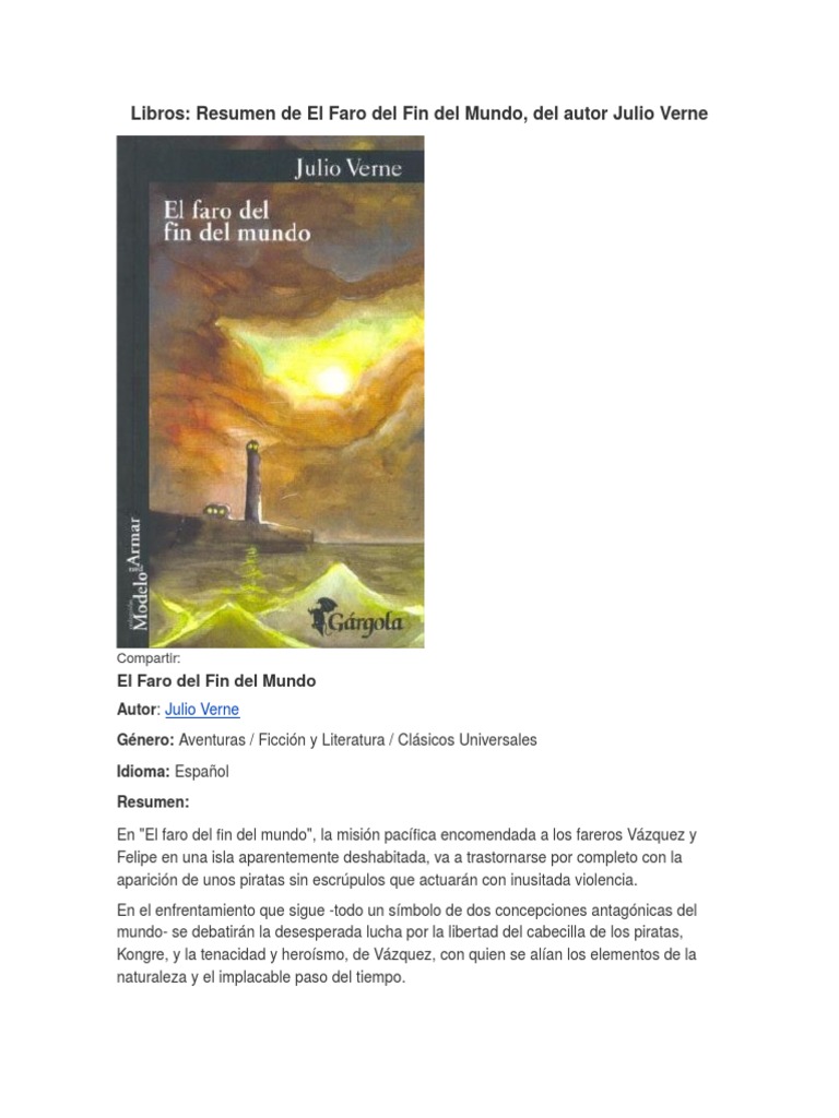 In the lighthouse at the end of the world, jules verne is seen at his simplest and best. The remoteness of the scene where the drama is laid supplies an element of dread of which advantage is skillfully taken, and the shortness of the period over which the story is extended adds excitement to the race against time which the villains of the piec. Faro del fin del mundo. We did not find results for: No antecedent improbability here has to be made good.